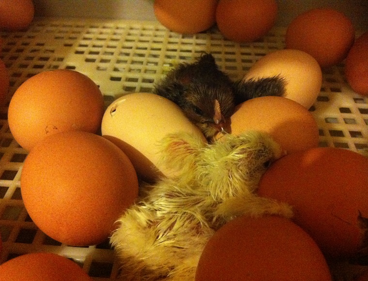 Some of the chicks needed a little helping hand as the humidity in the incubator had dropped, leaving them in danger of drying out too much in the long hatching process. I was ever vigilant, ensuring they were gently sprayed with warm water regularly to prevent from drying and dying during the hatching process and was there to greet them as they finally freed themselves from their calcium confines.