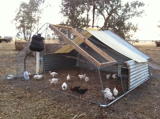And finally into the Chicken Shangri-La A-Frame. Stace did a great job of designing and building this chook house, which has an automatic waterer and feed station and is on sleds so that we can drag it to a new part of the paddock for fresh foraging. The new chickens LOVE IT!