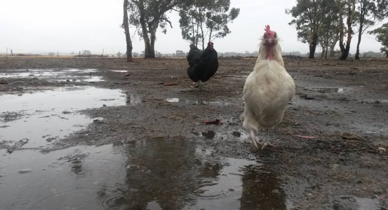 My poor baby chickens didn’t know what to make of it – they had never seen rain before! It took a couple of minutes to coax them out from their house in the morning. But all of the wet, bedraggled chooks enjoyed the cooler conditions. The rain encouraged bugs out of hiding places and soaked the newly spread hay. Yay for more soil creation with a bit of moisture!