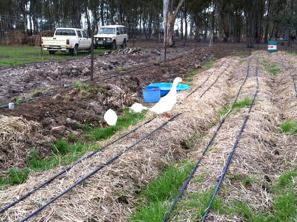 To counteract the immediate problems with drainage and lack of good quality topsoil, we decided to grow higher than the flat ground level, by building raised mound beds of manure, worm castings and soil. We also tried to utilise the benefits of the water-holding capacity of the clay by digging a trench to capture water, filling it with branches and green material for nutrients and then filling it over with a mound of earth. This ‘hugelkultur’ raised mound technique is proving very popular in permaculture and has been a long held growing technique in Europe for hundreds of years. (Ducks are optional…).
