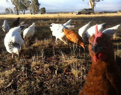 After a quick inspection, important nail trimming, lessons on how to drink from a water bowl and a dusting with Diatomaceous Earth to get rid of any fleas and mites, we introduced them to their new home – a converted Ford Falcon, to begin their lives as free range pasture poultry. It’s amazing how quickly they showed their innate chook behaviour, their newly trimmed feet instinctively making delicate scratching movements once they felt the dirt between their toes for the first time. To our delight, within hours they were scratching in earnest, dust bathing and enjoying the sunshine on their backs. And their new lease of life.